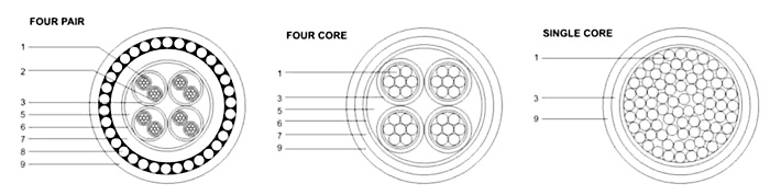 Construction 1 - Conductor 2 - Fire Barrier* 3 – Insulation 4 - Shield* 5 - Filler* 6 - Binder Tape* 7 - Bedding* 8 - Armour*/# 9 – Sheath